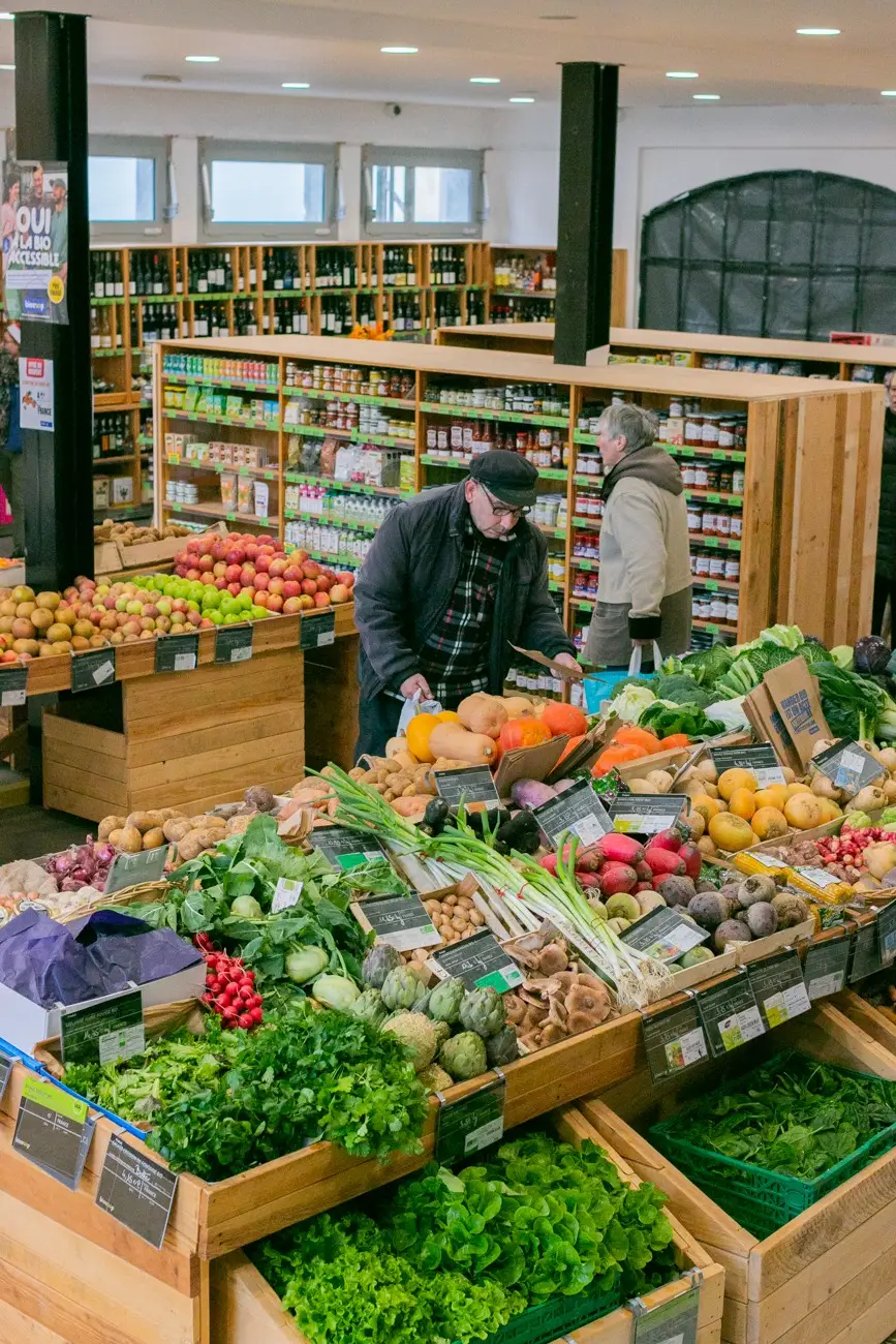 A l'entrée du magasin se trouve notre étal de fruits et légumes de saison, car chez Biocoop, nous nous engageons à respecter la saisonnalité pour vous proposez des produits bio, frais et de qualité.